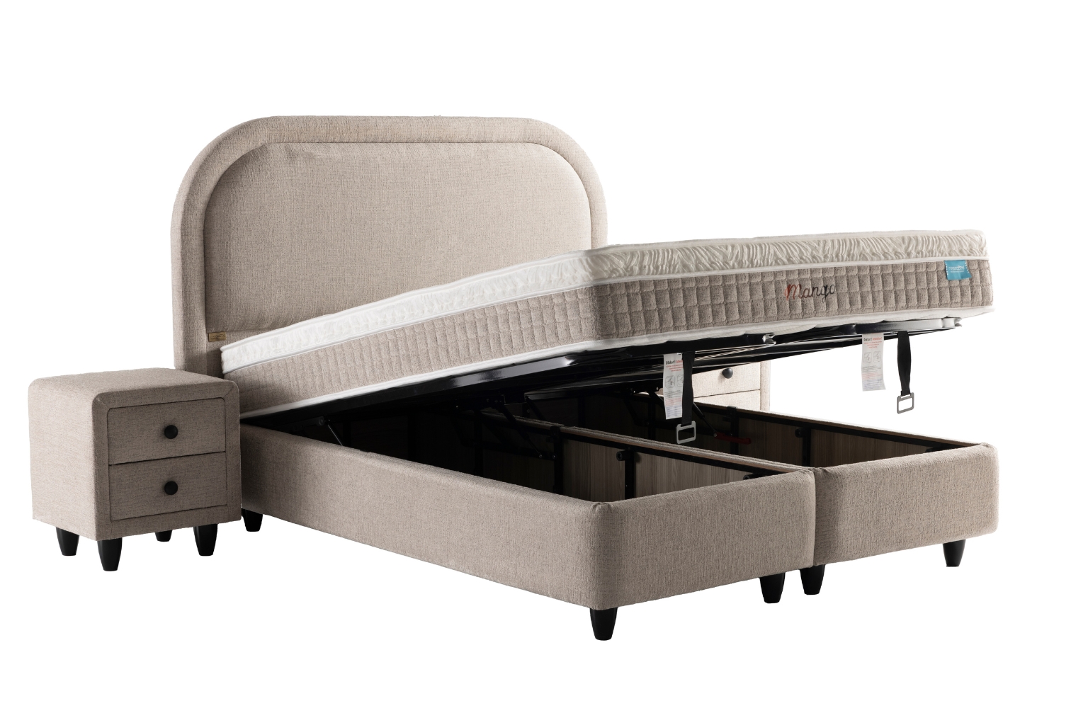 Het Mango model beschikt over twee opbergboxen die openen vanaf het voeteneinde. De opbergruimte loopt over het volledige matrasoppervlak en biedt ruime mogelijkheden voor het overzichtelijk opbergen van diverse spullen. De onderboxen zijn opgebouwd uit een volledig metalen frame en bekleed in dezelfde stof en kleur als de boxspring. Dankzij de gasveren opent en sluit de opbergruimte soepel en zonder inspanning.